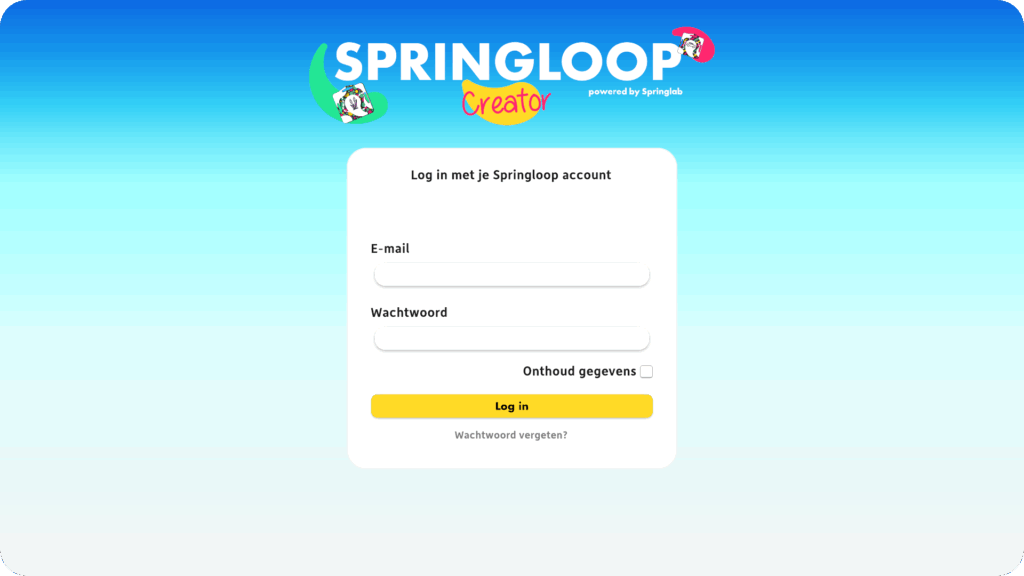 Na het openen van de Springloop Creator op je computer of Chromebook zie je het inlogscherm. Vraag je juf of meester om hier in te loggen. De inloggegevens zijn verstuurd via de e-mail.