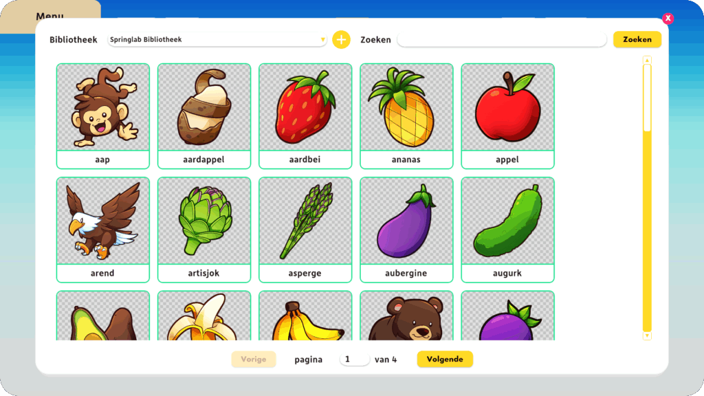Wanneer je op ‘Selecteer een plaatje’ klikt, opent de Springlab bibliotheek. Hieruit kun je voor ieder antwoord een plaatje selecteren.