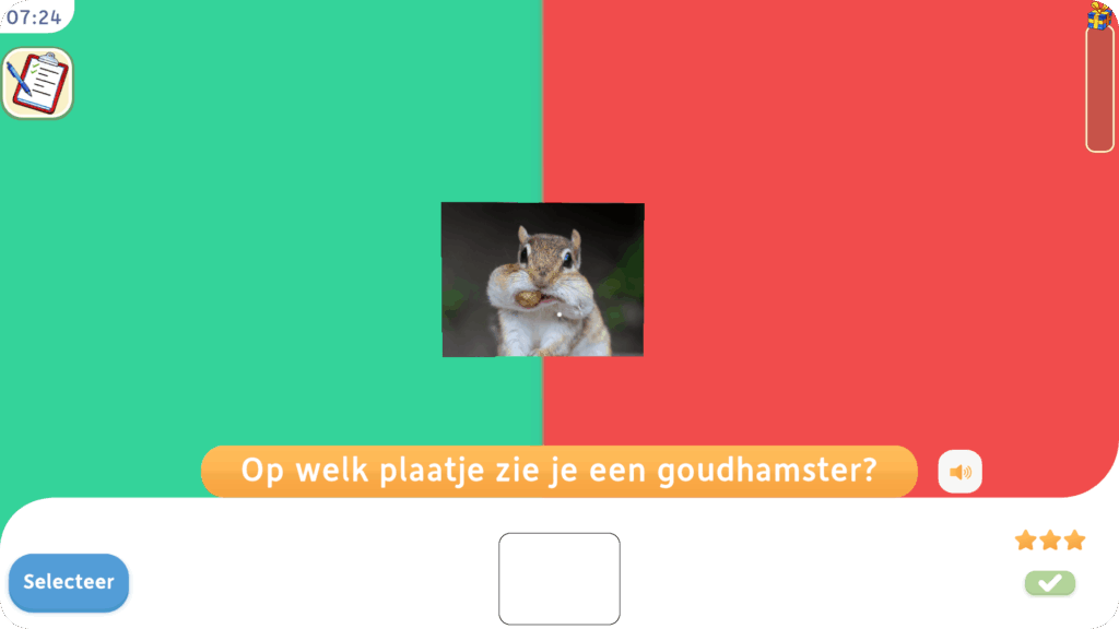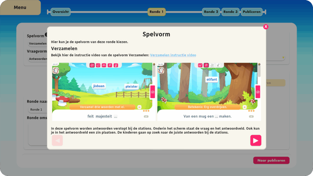 Jullie eerste vraag is gemaakt! Nu de eerste vraag is ingevuld kun je kijken hoe deze zometeen in Springloop eruit komt te zien. Klik hiervoor op de knop ‘Voorbeeld’ rechts in het scherm. Dit is een voorbeeld van een vraag voor spelvorm ‘Zoekplaat’. Je sluit dit scherm met het kruisje rechtsboven.