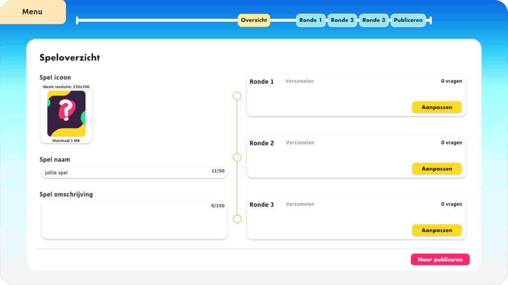 Per ronde zie je hier welke spelvorm er is ingesteld en hoeveel vragen er al zijn gemaakt. Is jouw team nog bezig met het bedenken van de naam van de game en de game knop? Dan kun je voor nu een tijdelijke titel bedenken en de game knop zo laten.